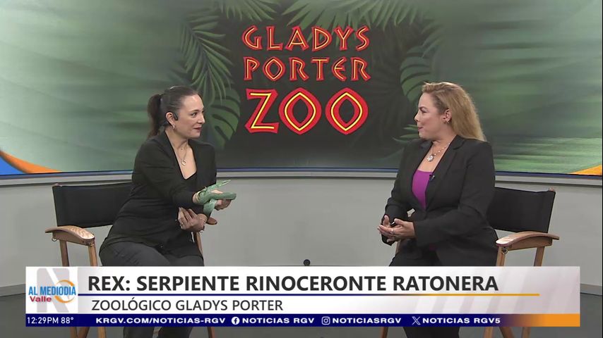Cynthia Garza Galván, representante del zoológico Gladys Porter de Brownsville presenta a una serpiente rata rinoceronte.